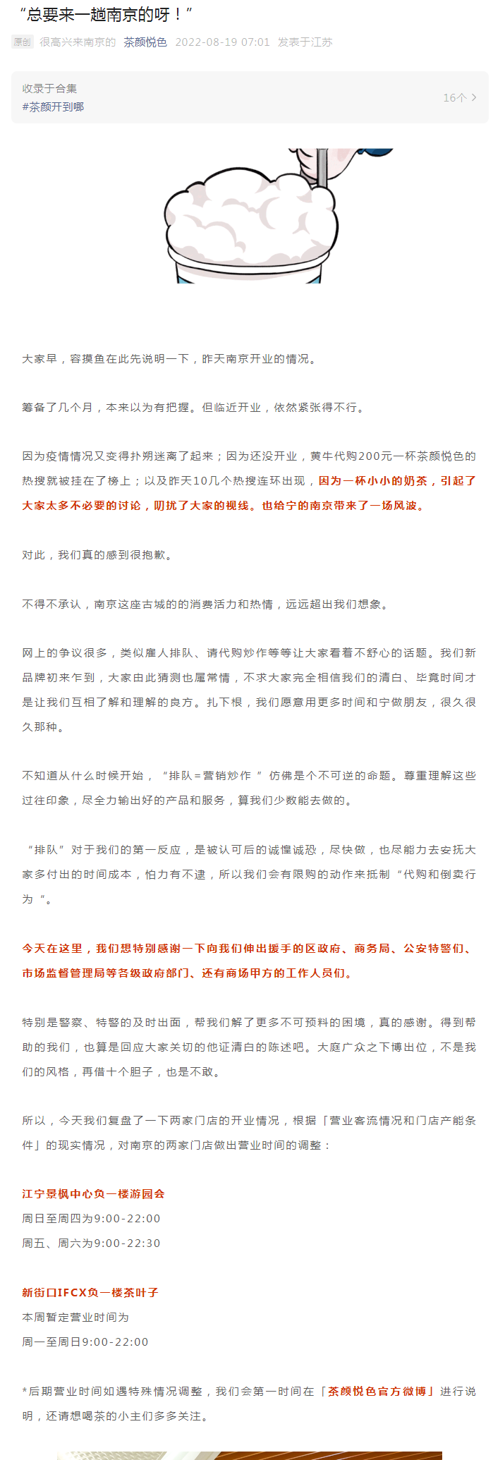 同時,茶顏悅色將根據營業(yè)客流情況和門店產能條件的現實情況,對南京的兩家門店做出營業(yè)時間的調整。